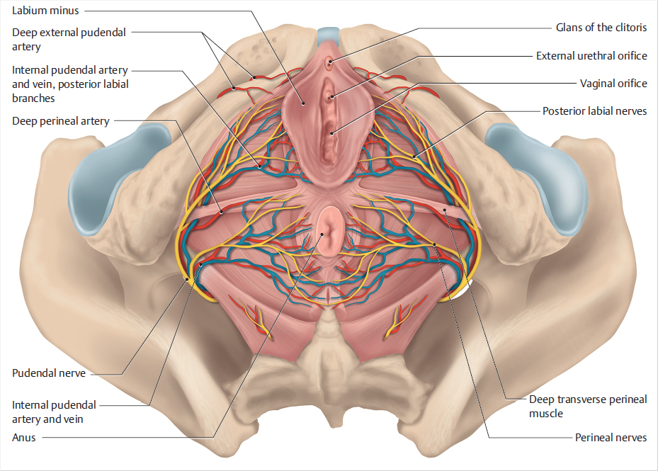 The posterior vulvoperineal region is supplied by the internal pudendal artery (IPA), a branch of the internal iliac artery. This artery enters the posterior pelvic floor through the pudendal canal (canal of Alcock) deep to the gluteus maximus. It then branches into the superficial perineal and deep perineal arteries. The superficial perineal artery courses anteriorly across the superficial transverse perineal muscle. Its terminal branches (the posterior labial branches) supply the posterior portion of the labia. The deep perineal artery passes through the urogenital diaphragm formed by the superficial and deep transverse perineal muscles and then courses anteriorly. The IPA measures about 10 to 12 cm in length with a diameter of about 1 to 1.5 mm. The region takes its sensory innervation from the pudendal nerve. This nerve follows the course of the IPA and gives rise to the perineal nerve whose superficial branch gives off the labial nerves that supply the perineum and labia (▶Fig. 2.26).