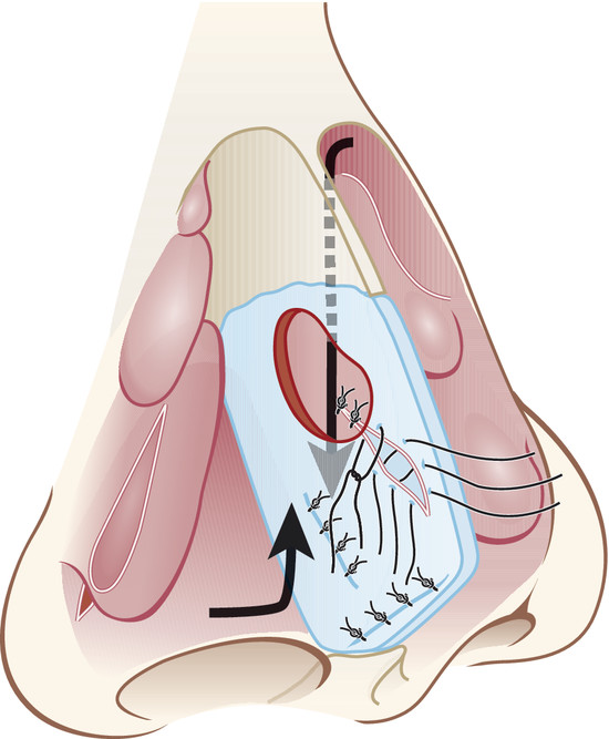 In case of small- to medium-sized perforation, the endonasal approach is the treatment of choice. The backward extraction-reposition technique allows the defects of cartilage and mucoperichondral-mucoperiosteal coating to be situated on two different levels, making safer the strength of the suture of the flap. 19 A further safe point is also provided by the inverted sliding flap suture (Fig. 20‑1). This asymmetric movement of flaps enables a nonopposing suture line and a better mucoperichondral blood supply to the repositioned graft. 20 The endonasal approach, compared with open techniques, enables a small incision, without sacrificing tissues or structures for improving the exposition. We must consider that any incision is bounded to undergo some degree of contraction after surgery, so it is more convenient to perform the lowest number of incisions, above all in this type of surgery. Furthermore, many perforation repair procedures often require the use of interpositional autografts between the repaired flaps and they are consequently accompanied by donor site morbidity. Contrarily, this technique, by repositioning the remaining nasal septum, does not require further supporting implants and that way allows the perforation to be closed without associated morbidity.