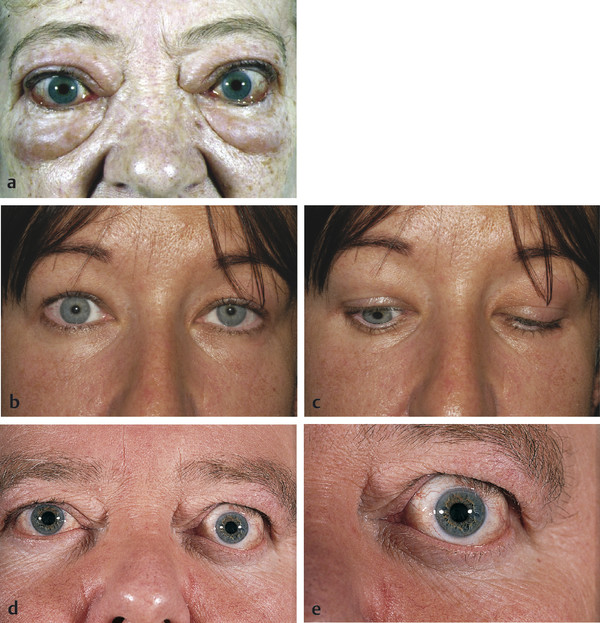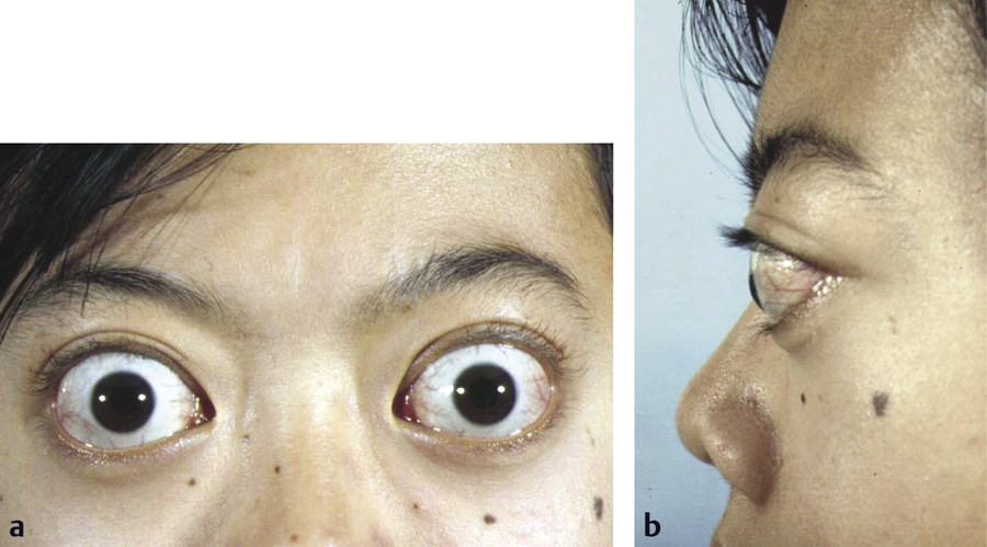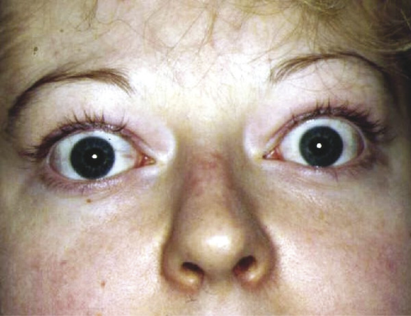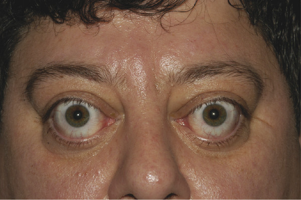 Patients with type 1, or “noninfiltrative,” orbitopathy tend to be younger and usually present with symmetrical proptosis, eyelid retraction, minimal inflammatory signs, and no extraocular muscle restrictions (Fig. 20‑4). These clinical features tend to be manifestations of hyperthyroidism and may even regress once the hyperthyroidism has been controlled. The diagnosis of thyroid eye disease in this subset of patients does not usually present a problem.