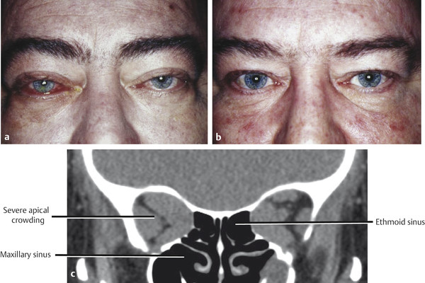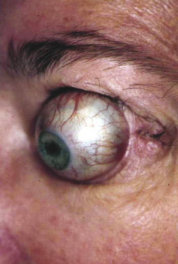 Patients with type 2 or “infiltrative” orbitopathy are usually middle-aged and run a much more fulminant course. The orbitopathy is likely to be more asymmetrical, and the patient is likely to present with chemosis, diplopia, and CON (Fig. 20‑5).