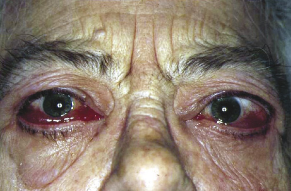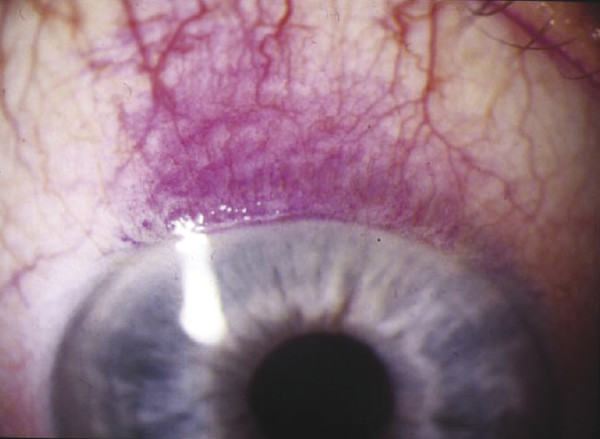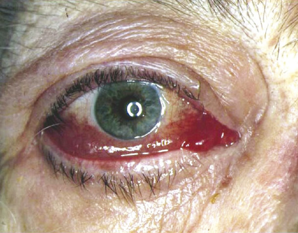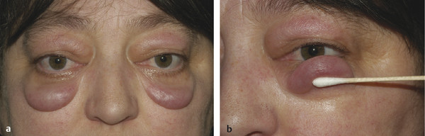 Caruncular edema may be quite subtle. This, in conjunction with conjunctival chemosis, is a clinical measure of disease activity and response to medical therapy. Chemosis can be very marked in some patients and may interfere with the normal distribution of the tear film (Fig. 20‑10). Erythema localized to the eyelids is not uncommon and may persist for many years.