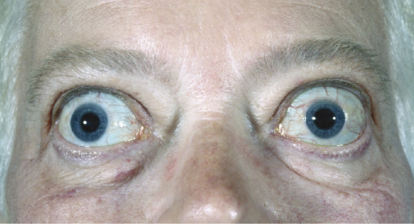 Although ptosis can develop in long-standing thyroid eye disease, usually because of a levator aponeurosis dehiscence secondary to marked upper eyelid edema, it is very unusual for patients to present with a ptosis. The presence of a ptosis should raise the suspicion that the patient has a concomitant ocular myasthenia or myasthenia gravis. Likewise, a divergent strabismus is unusual in thyroid eye disease and should again raise the suspicion of myasthenia (Fig. 20‑6).
