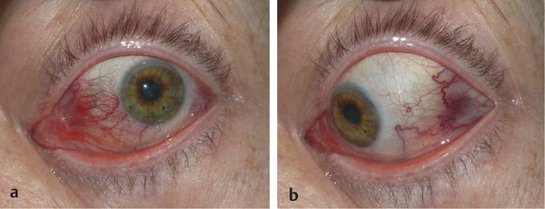 Injection of episcleral vessels occurs along the course of the horizontal recti, which helps to differentiate thyroid eye disease from a local-flow arteriovenous shunt (Fig. 20‑11).