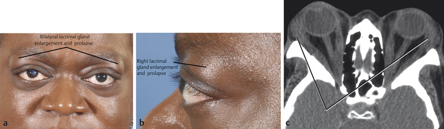 Lacrimal gland enlargement may also be seen in some patients, and, particularly in patients with shallow orbits and extreme degrees of proptosis, the glands may prolapse (Fig. 20‑17).