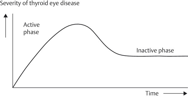 During the course of thyroid eye disease, the disease process passes through several phases. The initial phase involves worsening symptoms and signs with orbital inflammation, followed by a plateau phase during which the symptoms and signs become stable. A phase of gradual spontaneous improvement follows until eventually no further change occurs, although permanent abnormalities of both ocular function and cosmetic appearance may remain. These phases, however, vary greatly in duration from patient to patient. The typical course of thyroid eye disease in patients receiving no specific treatment, except that to control thyroid dysfunction, was first described by Rundle in 1957. He depicted this in a graph, which is known as Rundle’s curve (Fig. 20‑18).