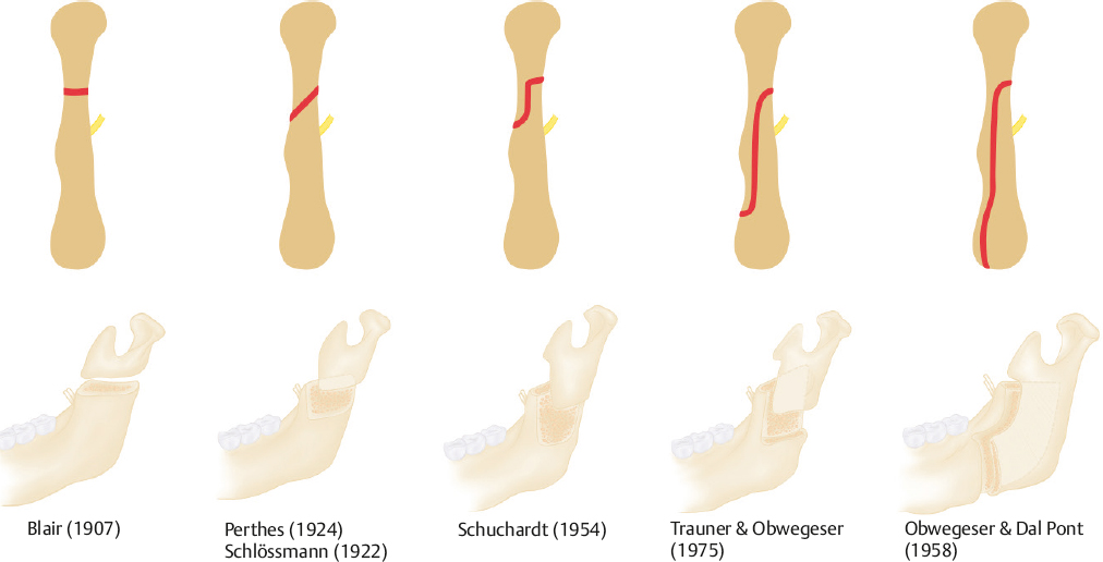 During orthognathic surgery’s history of more than 170 years, many surgeons have tried to set the concept of operation to achieve these purposes.1,2 Technically, the site and design of osteotomy, the approach for the osteotomy (extraoral or intraoral), the method for fixation (with wire or with plates and screws), and the emergence of the bone expansion and distraction osteogenesis techniques are among the innovations (Fig. 21.1).3,4,5 Since 1960 orthognathic surgery has made rapid progress alongside the advancements in technology such as the fixation plate and screw system for rigid fixation. Information technology (IT) development with software and 3D cone beam computed tomography (CT) and printing technology also have contributed to the improvement of analysis and diagnosis.