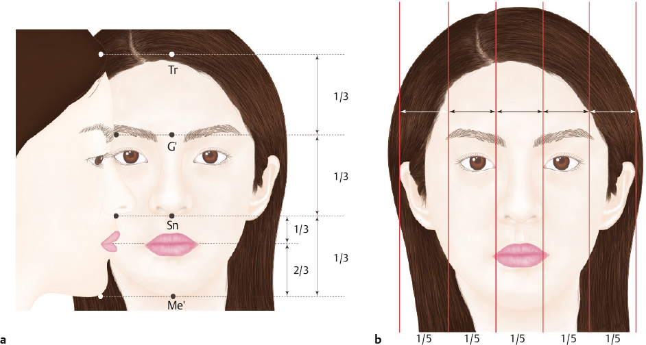 Harmony and symmetry are the key factors determining facial aesthetics, even though it should be recognized that what defines a beautiful face can differ according to sociocultural factors. In the frontal view, the face can be divided equally into the upper third (trichion to glabella), middle third (glabella to subnasale), and lower third (subnasale to menton) (Fig. 21.3a). Vertically the frontal plane is composed of equal fifths (rule of fifths) (Fig. 21.3b).