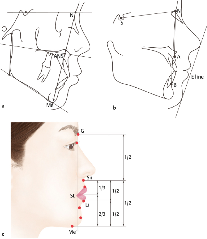 Lip projection is also a determining factor of facial aesthetics. Asians usually have distinctive characteristics of the lip due to a combination of thickness, bimaxillary protrusion, and labioversion of the upper and lower incisors. The ideal upper lip should be balanced with the nose and cheek, and the lower lip should be slightly posterior to the upper lip. The amount of teeth exposure depends on the vertical height of the maxilla. When both lips are in repose, the vermillion of the lower lip should be ~ 25 to 30% more exposed compared with the upper lip. This is especially important for orthognathic surgery for a cleft lip-palate patient. When smiling, the incisors should be at least threequarters exposed yet not exceed 2 mm of gingival show. A gummy smile, or excessive gingival show during smiling, is not a reliable indicator of the adequacy of maxillary height. Finally, facial symmetry can be assessed based on several relationships, involving the midsagittal plane through the nasal tip, midline of the upper and lower incisors, midline of the symphysis of the chin, and the gonion position of either side. Dynamic symmetry can be assessed by observing the level of the oral commissures and teeth exposure on smiling. Occlusal plane canting should also be assessed.