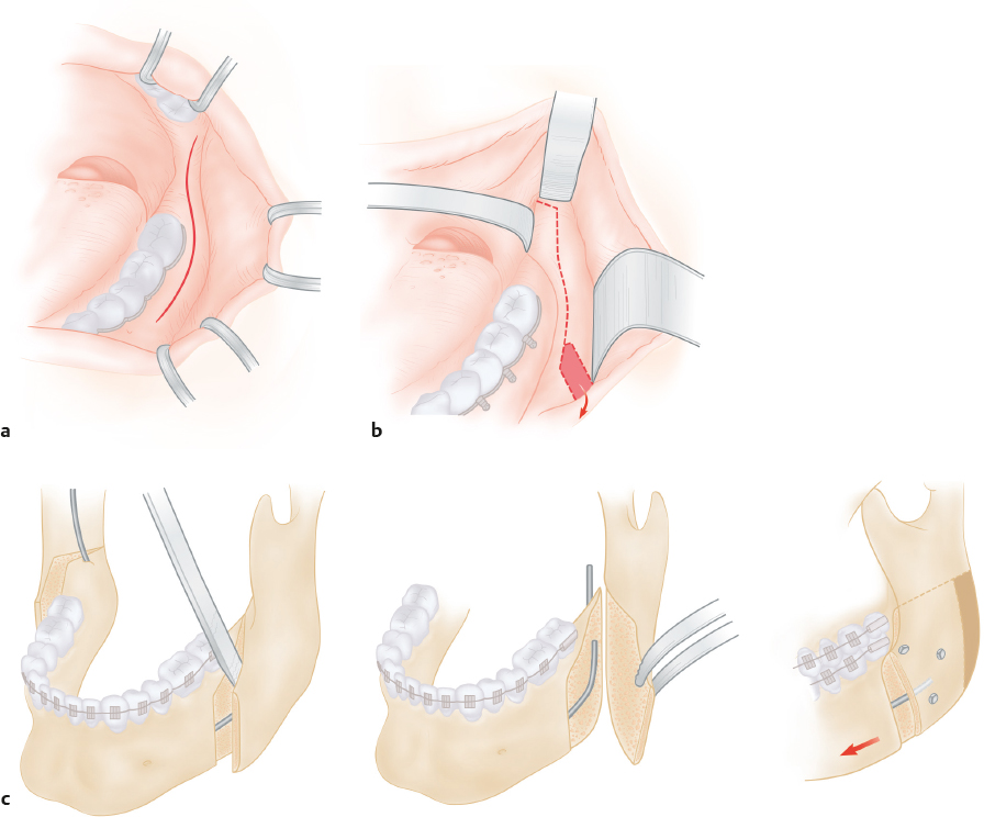 Buccal cortex osteotomy should be designed depending on whether the objective is to achieve setback, advancement, or transverse rotation of the mandible. This can range from a vertical osteotomy near the first molar area to an oblique line running from the second molar to the mandibular angle. Once again, adequate protection is necessary to avoid injury to the facial artery and the marginal mandibular branch of the facial nerve.
