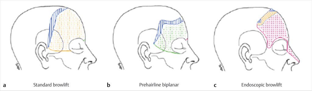 Currently, the preferred method of brow lift is the endobrow technique because of comparable brow elevation, long-lasting results, and improved cosmesis. However, if an elevation or advancement of the hairline is intended, then an open technique must be used.