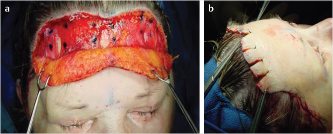 Fig. 21.2 (a) Open pre-hairline approach with subcutaneous elevation and endoscopic approach through the frontalis muscle to release the supraorbital periosteum. (b) Tension-free redraping of excess skin for excision after plication of the frontalis muscle.
