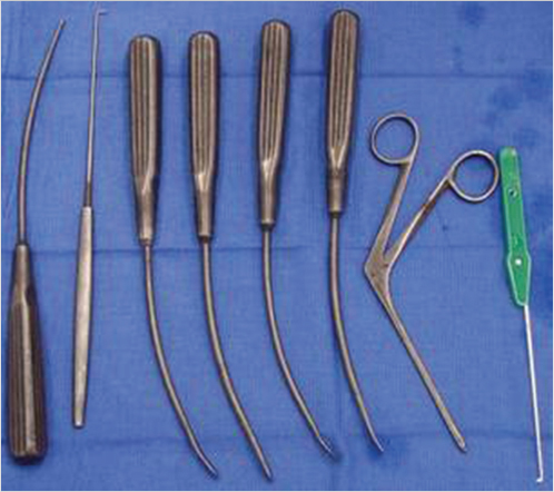 Fig. 21.3 Various blunt dissectors, note hook scalpel on far right.