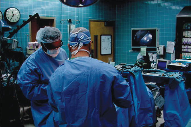 Fig. 21.5 Note operative surgeon is at the head of the patient, the monitor is at the patient’s feet, and the assistant is to the side.