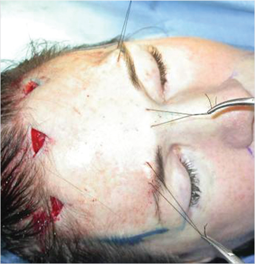 The triangular shape allows for additional access to permit passage of the endoscope through the incision without extending its length. In addition, the horizontal closure of the triangular incision provides a slight amount of extra brow elevation. The three minimal access incisions are placed at the frontal pre-hairline level, one at the midline and the two at lateral incisions in line with the lateral limbus. The size and location can be adjusted to account for asymmetries with regard to forehead ptosis.