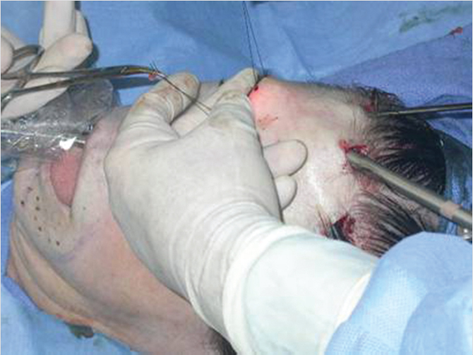 At the end of the procedure, the incisions are closed transversely. After closure of the access incisions, temporary suspension is obtained with cable sutures. A single staple is placed across the closure of each incision and approximately 4 cm posterior within the hair-bearing scalp. A 3–0 Nylon suture is passed through both staples and tightened to suitably suspend the brow during the immediate postoperative period. This direct, external suspension allows for adjustment to avoid postoperative asymmetries. The staples and nylon sutures are left in place 3 to 5 days. This time period allows for adhesion of the periosteum and long-term effect. The resection of the depressor muscles obviates the need for other methods of suspension. Postoperative suspension has been described with internal sutures securing through tunnels drilled in the external table of the frontal skull or using bone screws. Absorbable tacks are also available to stabilize the soft tissue. A simple method is the use of external nylon sutures thread through staples across the three endoscopic incisions and several centimeters posterior in the hair-bearing scalp (Fig. 21‑10).