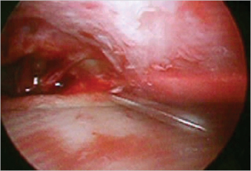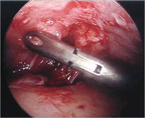 Fig. 21.8 Endoscopic view of grasper resecting depressor muscles.
