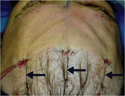 A hairline incision is preferable in patients with long foreheads (>10 cm), as it avoids lengthening the forehead. Incisions are placed perpendicular to the skin and parallel to the hair follicles, as it allows the growth of hair through the scar making it very acceptable to patients. 15 A subcutaneous approach will directly remove the skin attachments to the muscle, effectively addressing the transverse wrinkles (Fig. 21‑2).