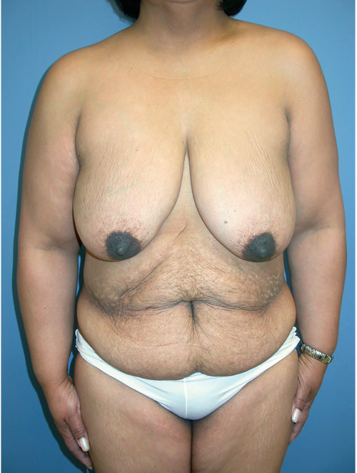Fig. 21.1 A mature, multiparous woman demonstrating grade 3 ptosis after pregnancy and lactation. Note upper pole involutional atrophy despite relative mammary hypertrophy, with stretch marks on the upper poles resulting in descent of the breast gland.