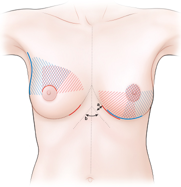 A circumareolar incision is the preferable choice for partial mastectomy (red line on the right breast in Fig. 21-1). A lateral S-shaped incision is also applied for the tumor in the upper outer quadrant (blue line on the right breast in Fig. 21-1).