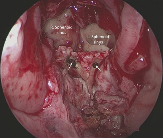 Fig. 21.5 View of total septal perforation and the sphenoid rostrum with the holes needed to anchor the pericranial flap in its posterior portion. Real case.