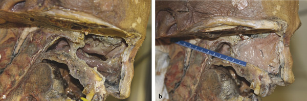 Fig. 21.7 (a) The picture shows the total septal perforation in a cadaveric specimen. (b) The picture shows the closure of this perforation with the pericranial flap.