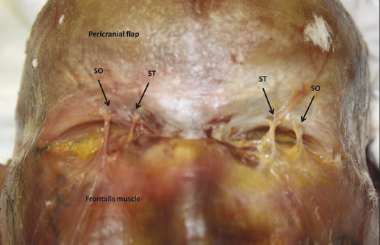 Although the division of the SO and ST arteries into superficial and deep branches occurs in most cases at the level of the orbital rim or below, in some cases it occurs above that level. Therefore, it is recommended avoiding extending the separation of the pericranial flap from the galea-frontalis muscle layer into the 10 mm above the orbital rim, to prevent injury to the vascular supply. 17