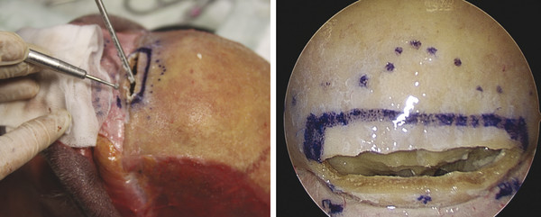 5. If additional length of the pericranial flap posterior to the coronal incision is needed, care must be taken in making the coronal incision to ensure that the pericranium is not divided. Extend the incision down between galeal layer and loose areolar tissue, and identify this plane of dissection.