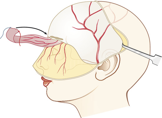 The anterior part of the scalp, where you can harvest the pericranial flap, is supplied mainly by two supraorbital (SO) and two supratrochlear (ST) arteries, one of each on each side (see Fig. 21‑1). Both arteries are branches of the ophthalmic artery that is a branch of the internal carotid artery. 16 These arteries enter into the scalp just below the orbital roof and divide either near or above the SO rim into both superficial and deep branches. The superficial branches run through the galea-frontalis layer of the scalp, and the deep branches ascend supplying the pericranium. 17 These arteries anastomose with each other and with the superficial temporal artery laterally, communicating the external and internal carotid systems. 15