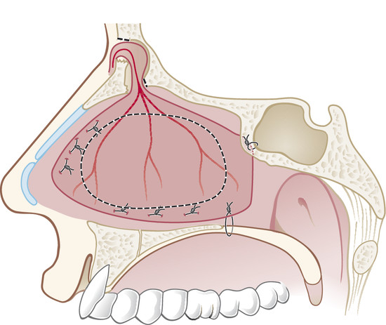 13. The flap is sutured anteriorly to the edge of the perforation and inferiorly to the mucosa of the floor of the nasal cavity with absorbable stitches. In its most posterior portion, a suture passing through the soft palate is performed. It is anchored to the sphenoid rostrum with two stitches that pass through two holes made in the sphenoid rostrum, above the choana, thus creating a new septum made of two layers of pericranial flap (Fig. 21‑5, Fig. 21‑6, Fig. 21‑7, Fig. 21‑8).