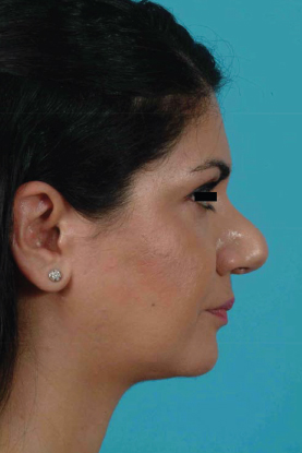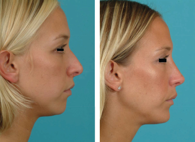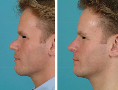 When analyzing lateral view photographs, nasal profile alignment is a central focus. Nasal projection relative to the forehead and chin is analyzed. For example, an underprojected chin makes the nose appear larger. A chin implant may complement a rhinoplasty in these patients (Figure 21.3). A lower nasofrontal angle also may make the nose appear shorter. In these cases, radix grafts may be employed to make the nose appear longer (Figure 21.4).