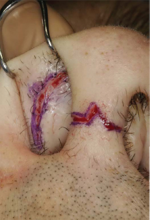 Patients who have had prior surgery or synthetic material placed in their nose tend to have skin that is more devascularized and thinned. Extra care must be dedicated to dissection and elevation of the skin soft tissue envelope in these patients.