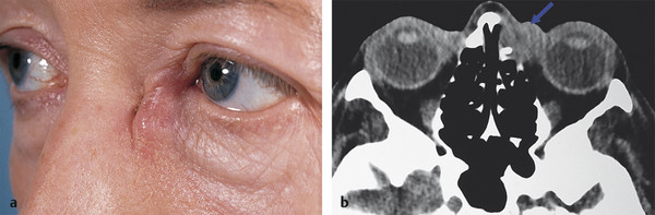 Fig. 21.1 (a) A patient who presented with a history of painless epiphora and was believed to have a nasolacrimal duct obstruction and a secondary lacrimal sac mucocele. She was referred after a biopsy performed during an attempted external dacryocystorhinostomy. The biopsy revealed a lacrimal sac squamous cell carcinoma. (b) An axial CT scan of the patient demonstrating a mass in the region of the lacrimal sac (arrow).