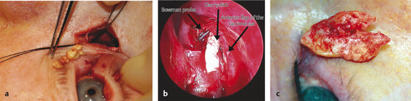 If syringing of the lacrimal drainage system has suggested a canalicular obstruction, careful probing of the canaliculi using a 00 Bowman probe is undertaken. The probe should not be forced through any obstructions. If concretions are present, such as after chronic actinomyces infection, the surgeon may feel a gritty sensation with the probe.