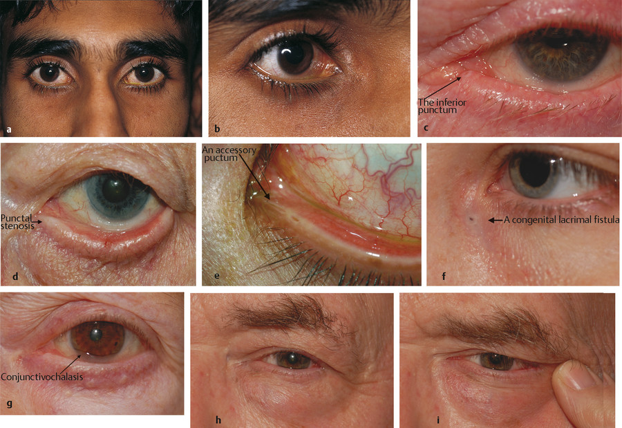Fig. 21.3 (a) A patient referred with a long-standing history of constant epiphora. (b) A side view revealed an anterodisplacement of the anterior limbs of the medial canthal tendons, drawing the puncta away from the globe. The patient has a prominent nose. The diagnosis is Centurion syndrome. The treatment is a repositioning of the medial canthal tendons. Failure to recognize the true cause of the epiphora can lead to inappropriate surgical procedures. (c) A lower eyelid punctal ectropion. (d) Inferior punctal stenosis in the presence of a chronic lower lid involutional ectropion. (e) An accessory inferior punctum. (f) A congenital lacrimal fistula leaking tears. (g) Conjunctivochalasis. (h) “Kissing puncta.” The eyelids meet medially, preventing access of the tears to the puncta. (i) The effect of a lateral tarsal strip procedure is being mimicked by drawing the eyelid laterally. The puncta have now separated. A lateral tarsal strip procedure is the treatment of choice for this problem.