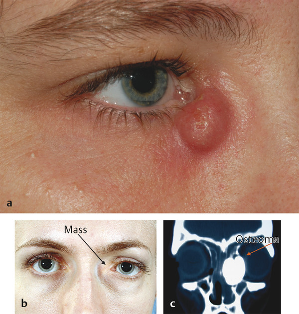 Fig. 21.5 (a) A patient with chronic dacryocystitis and a large non-expressible lacrimal sac mucocele. (b) A patient presenting with left epiphora and firm palpable mass at the medial canthus, extending above the medial canthal tendon. (c) A coronal CT scan of the same patient showing a large ethmoidal osteoma.