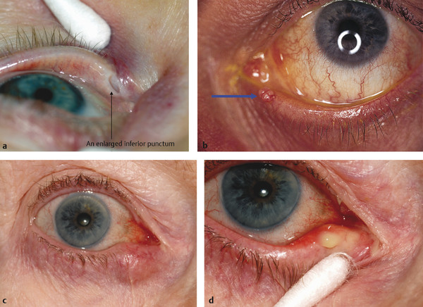 Fig. 21.6 (a) An enlarged inferior punctum after a previous three-snip punctoplasty (surgeon’s view from above). (b) A papillomatous lesion (arrow) obstructing the inferior punctum. (c) A patient with a swelling of the medial aspect of the lower eyelid and a history of chronic epiphora. (d) Pressure applied to the lesion caused a regurgitation of a mucopurulent discharge from the inferior punctum.