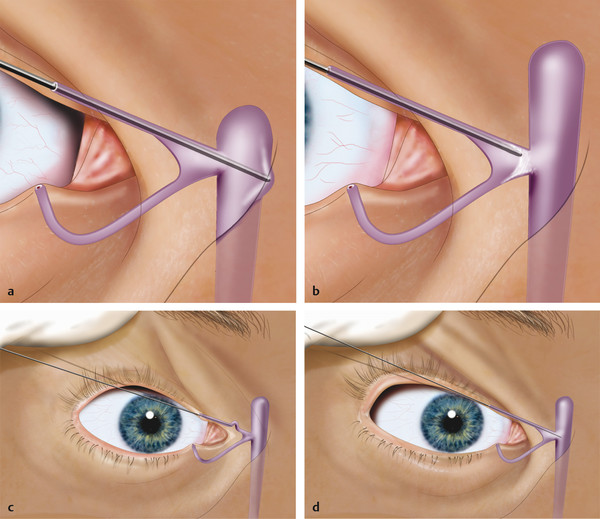 Fig. 21.7 (a) A hard stop is felt as the lacrimal probe enters the lacrimal sac and strikes the bone on the medial aspect of the lacrimal sac. (b) A soft stop is felt in the presence of a canalicular or common canalicular obstruction. (c) A false impression of a soft stop has been caused by inadvertently pushing the end of the probe against the side wall of the canaliculus. (d) Care should be taken to ensure that the eyelid is drawn laterally and that the probe is advanced respecting the anatomical configuration of the canaliculus.