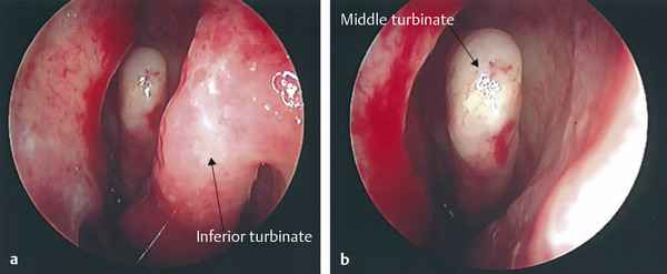 Fig. 21.8 (a) An endoscopic view of the nose after the use of a nasal decongestant. The inferior turbinate is indicated by the arrow. The inferior meatus and the opening of the nasolacrimal duct lies under the inferior meatus. (b) The middle turbinate is indicated by the arrow. The middle meatus lies beneath this.