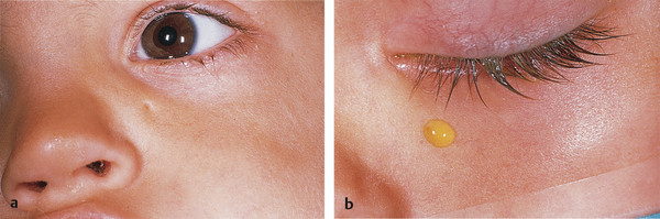 A much rarer condition of newborn infants is an amniocele. This appears as a soft bluish mass at the medial canthus below the level of the medial canthal tendon. It may simply respond to firm pressure applied to the mass if the associated membranous obstruction of the nasolacrimal duct gives way. It is important to differentiate the lesion from a meningocele or a capillary hemangioma, because these can have very similar appearances.