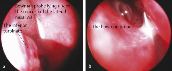 Usually the membranous obstruction is felt to give way. The probe can be visualized beneath the inferior turbinate with a small endoscope (2.7 mm, 0 degrees). This allows confirmation that a false passage has not been created through the nasal mucosa of the lateral nasal wall or inferior turbinate, a common cause of failure (Fig. 21‑12).