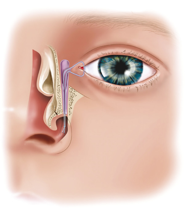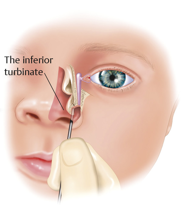 It is essential to perform a nasal examination before embarking on lacrimal drainage surgery. This should be performed using a rigid nasal endoscope and is undertaken to exclude intranasal pathology, such as allergic rhinitis, polyps, or tumors that may contribute to obstruction of the lacrimal drainage system, and to exclude anatomical variations that may adversely interfere with lacrimal drainage surgery, such as a deviated nasal septum or concha bullosa. Although the nose can be examined using a headlight and a nasal speculum, an endoscope provides a far superior view of the intranasal structures.