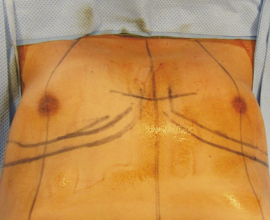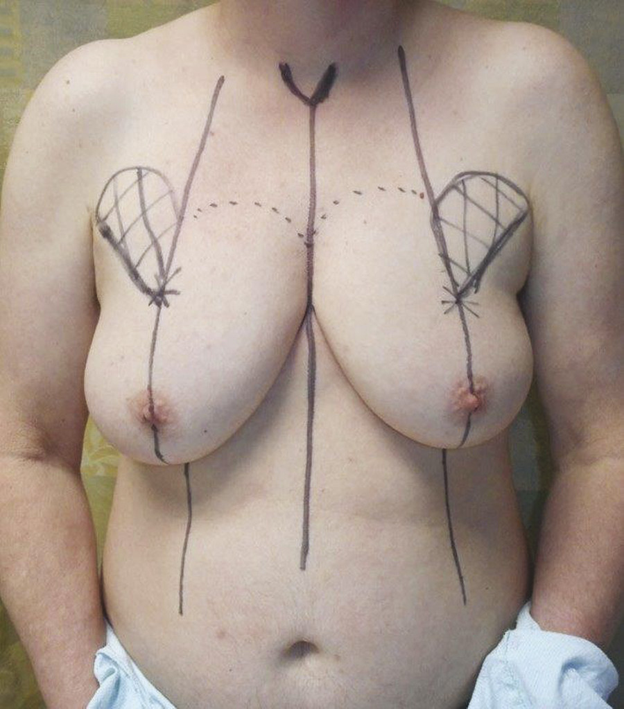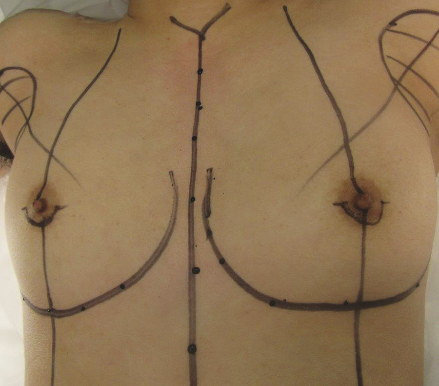 Prior to surgery, sequential compression devices are placed and intravenous antibiotics are administered. Following induction of general anesthesia, chemoprophylaxis for venous thromboembolism is administered subcutaneously (either fractionated or unfractionated heparin depending upon institutional policies). With each of the operative techniques, the patient is positioned supine, with the arms abducted on foam rests with flexion at the elbow, and a lower body forced-air warming blanket is placed. Draping should allow access to the surgical field from both above and below the upper extremity. In addition, the patient is positioned and secured in anticipation of flexing the back of the operating table in order to assess symmetry and guide placement of the nipple-areola grafts. The reference points are tattooed with methylene blue to aid with intraoperative identification (Fig. 21‑9). If free nipple-areola grafts are to be performed, the NAC is resized to a diameter of 2.5–3.0 cm. In addition, if a nipple reduction is required, a wedge resection of the lower pole of the nipple may be performed. The nipple-areola grafts are harvested, defatted, and placed in moist gauze sponges for later use. When a skin resection is planned, regardless of the technique, the anticipated area of skin resection is incised in order to facilitate breast removal. The skin flaps are developed at the junction between the breast tissue and the subcutaneous fat at the level of the breast capsule. The medial dissection of the breast stops at the sternal border, and the perforating branches of the internal mammary artery are preserved, if possible. The lateral dissection proceeds subcutaneously over the serratus muscle, with preservation of the serratus fascia, and the breast is reflected off the chest wall, with preservation of the pectoralis fascia (Fig. 21‑10). Liposuction of the IMF, the lateral chest, and the axillary tail is performed. Some surgeons place fibrin sealant in the cavity. The patient is placed in a semi-Fowler position, and the skin flaps are tailored and inset in a layered fashion over a 15 French closed suction drain. Following resection, the breast tissue is marked and sent to pathology for routine examination. Additionally, some surgeons choose to weigh the specimen intraoperatively.