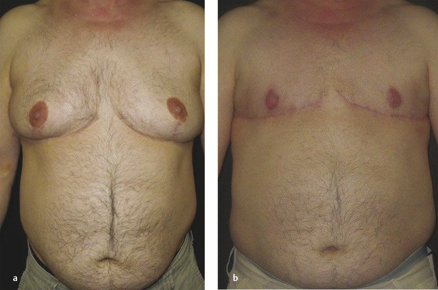 Chest surgery is generally performed as an outpatient procedure, unless the patient is traveling or has other medical comorbidities. Following surgery, an elastic compression wrap remains in place for 4–6 days. In addition, closed suction drains are placed bilaterally, and patients are instructed to monitor and record output. Discharge medications include an oral narcotic or non-narcotic alternative for analgesia, an antibiotic, a stool softener, and an antinausea medication. Patients are encouraged to ambulate as soon as possible. Patients can bathe, but not shower, until dressings are removed. Lifting is limited to 10–15 lb (4.5–6.8 kg) for several weeks, and patients sleep with their back elevated for 1 week after surgery. At an office visit 4–6 days after surgery, dressings are changed, bolster dressings are removed from the NACs, and local care with a topical antimicrobial ointment is initiated. The compression wrap is continued for 3 weeks after surgery, followed by a compression shirt for an additional 3 weeks. Drains are removed when output is less than approximately 30 mL per 24-hour period. It is recommended that patients stay locally for approximately 1 week after surgery before travel. For patients on hormone therapy, testosterone can be restarted a few days following surgery.