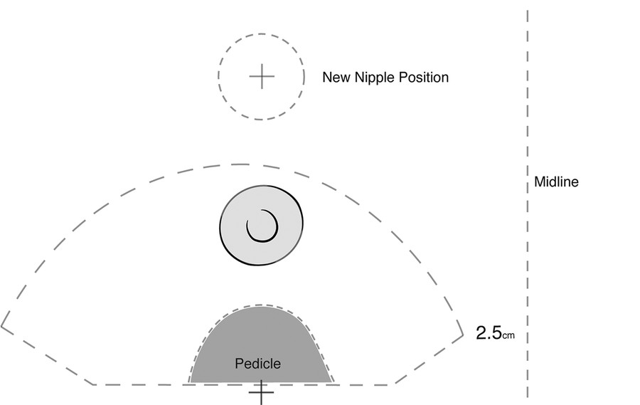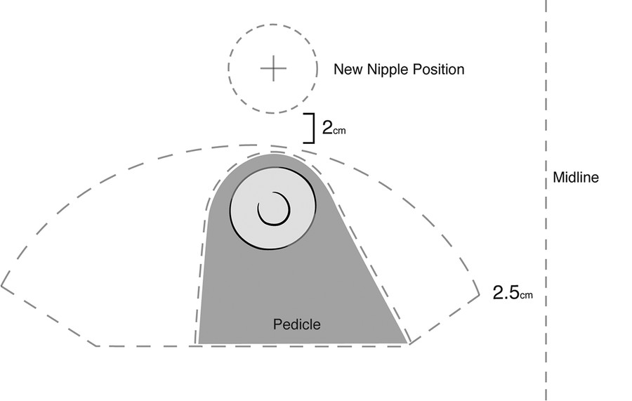 Nipple reduction is commonly employed, often in conjunction with free nipple-areola grafts. FNGs necessitate thinning of the nipple to enable graft survival. In addition, liposuction is frequently used for both chest wall contouring and discontiguous undermining of the IMF and lateral chest wall. While free nipple-areola grafts are the most common technique for nipple transposition, some surgeons maintain the NAC on a dermoglandular pedicle. While this technique may preserve sensation to the NAC, it may also lead to residual breast fullness. Patients should understand that they may have fullness using this technique. This residual fullness may be reduced at a secondary surgical setting with direct excision or liposuction. The pedicle will be less noticeable in obese subjects, but these individuals usually have larger breasts and longer nipple-to-IMF distances. For some surgeons, the decision to utilize an FNG may be based upon the distance from the nipple to the IMF. When this distance exceeds 6–7 cm, an FNG may be preferable so as to prevent secondary contour deformities related to the bulk of the dermoglandular pedicle. 25