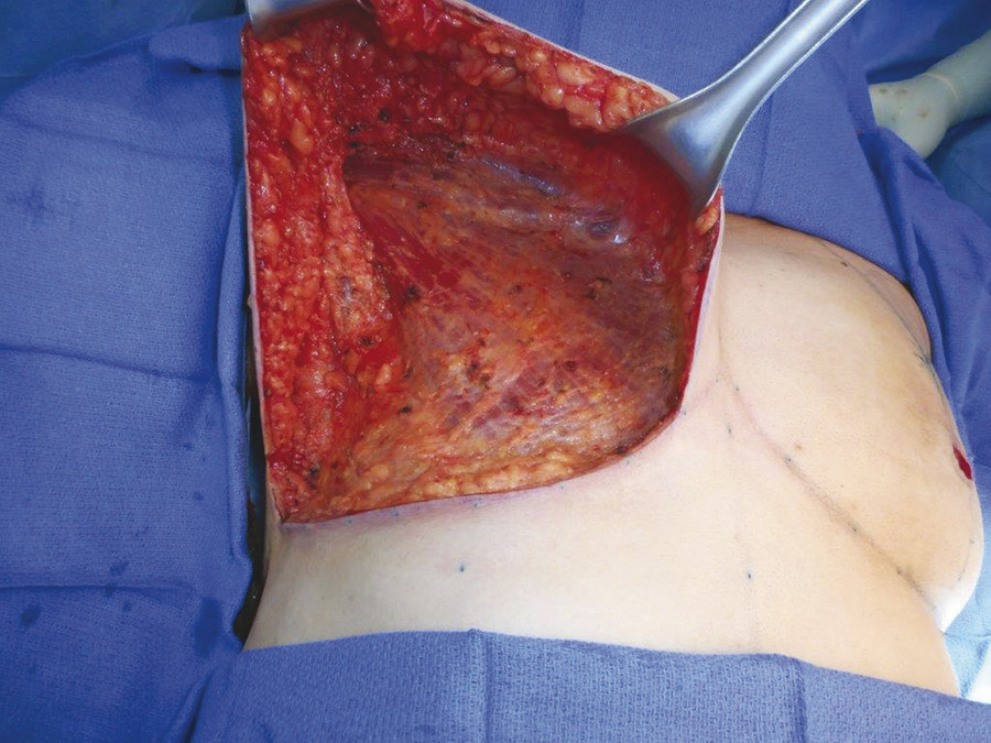 Following development of the pedicle, the upper incision is made down to the level of the breast capsule. Dissection proceeds superiorly and medially to the pectoralis fascia and laterally to the fascia overlying the serratus anterior muscle.