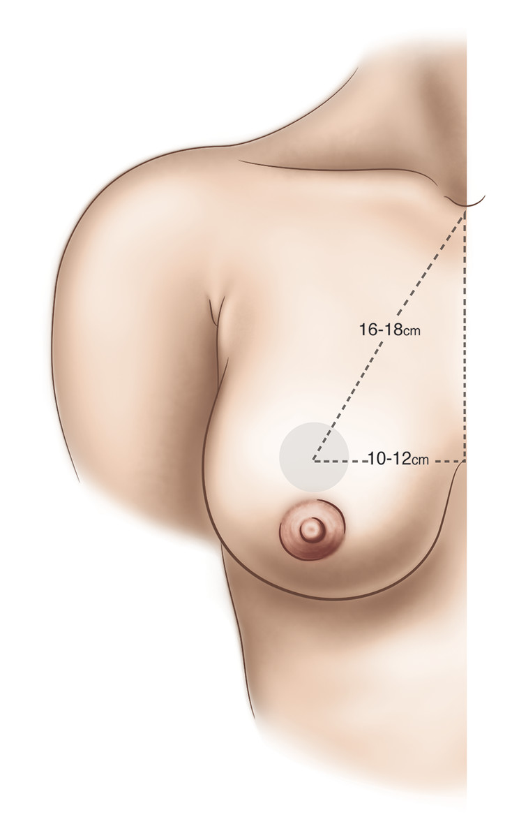 In our experience, clinical judgment is best in positioning the NAC in trans men. In general, the nipple-areola is positioned medial to the lateral border of the pectoralis major muscle, approximately 1–2 cm above the inferior insertion of the pectoralis major muscle. While specifics regarding nipple placement may vary, 26 , 30 placement falls within the parameters suggested in Fig. 21‑11. In obese individuals, the border of the pectoralis may be difficult to define. Final adjustments to nipple position may be performed at the time of wound closure.