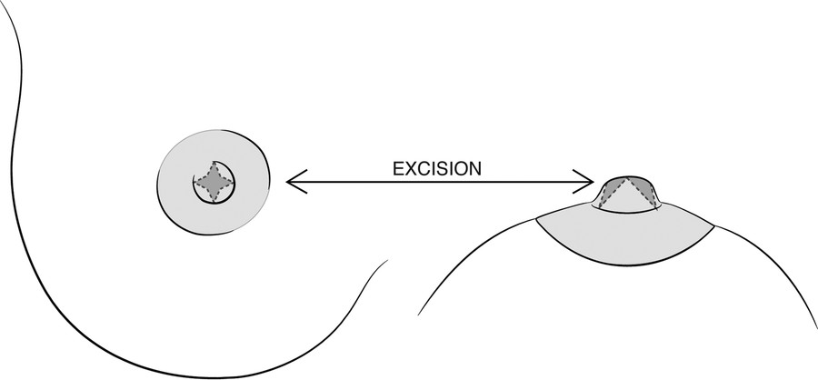 Final adjustments to nipple position are performed at the time of wound closure with the patient in a semi-Fowler position. The nipple position can be adjusted so that the inferior border of the areola is approximately 2–2.5 cm above the IMF and equal distance from the midline and sternal notch. These measurements may vary based upon common asymmetries in chest wall dimensions. When a pedicle technique is used, a 2 × 1–cm full-thickness ellipse of skin is excised in the chest flap (Fig. 21‑13). Due to flap tension, the ellipse becomes circular upon final inset. The nipple-areola is sutured with a single layer of interrupted, buried, absorbable sutures. In pedicle procedures, when a nipple reduction is required, it is performed at a secondary setting utilizing a three- or four-pointed star-shaped excision (Fig. 21‑14). When FNGs are used, the grafts are defatted and inset on a dermal bed. Fixation of the nipple graft is accomplished with a bolster dressing sutured over petrolatum gauze and an absorbant cotton pad. A compression wrap with elastic bandages is then placed.
