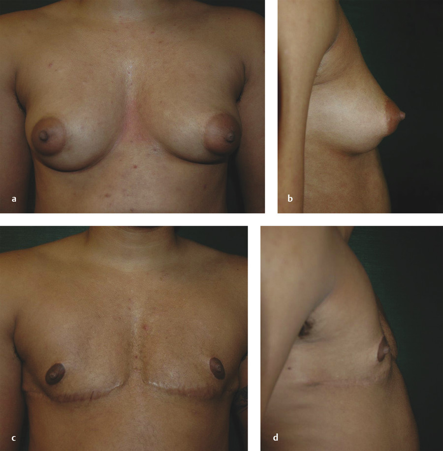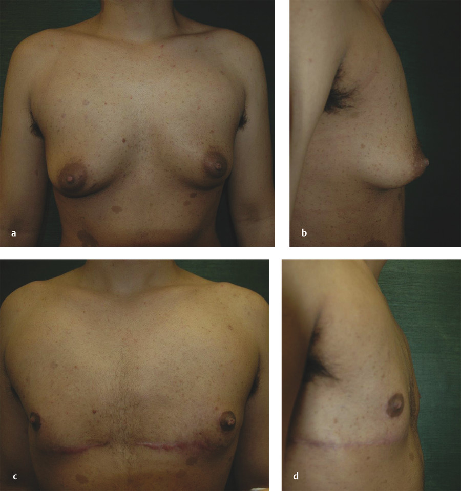 Examples of several chest surgeries are provided. Fig. 21‑15 shows a 27-year-old trans men before and 9 months after pedicle reduction. Fig. 21‑16 shows a 24-year-old trans men before and 6 months after chest surgery using the FNG technique. Finally, Fig. 21‑17 shows a 20-year-old trans men and 6 months post chest surgery using the inferior pedicle technique.