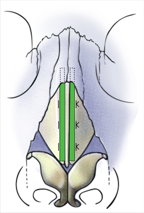The aesthetic uses of spreader grafts (Fig. 22.1) include straightening or strengthening a dorsally deviated septum, preventing or correcting narrowing of the midvault, and establishing uniform and symmetric dorsal aesthetic lines, and in some cases widening a narrow middle vault.