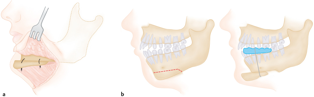 The concept of osseous genioplasty was first presented by O. Hofer in 1942. He utilized a three-step technique: segmental osteotomy, relocation, and fixation of the chin bone to the new position.2 Hofer described first creating a horizontal osteotomy of the anterior part (mentum) of the mandible via an extraoral submental incision to correct prognathism and micrognathia (Fig. 22.1a). H. Obwegeser (1957) later described advancement sliding genioplasty via an intraoral approach to avoid visible chin scars (Fig. 22.1b).3